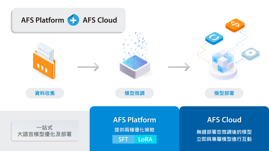 台智雲以福爾摩沙大模型(FFM)為基礎推出企業級生成式 AI 解決方案,包含「AFS ModelSpace(模型即服務)」、「AFS Platform + AFS Cloud (一站式大語言模型優化及部署服務)」,推論和優化均可 No-code 一站式完成。 AFS 模型優化推論服務支援各式繁中強化模型 Llama3.3-FFM-70B-32K、FFM-Mixtral-8x7B 等,也提供各式開源模型如 Meta Llama3.3-70B 和具備台灣本土特色的 TAIDE 模型。 無論是想直接使用各式 FFM 和開源大模型、或打造企業專屬模型,AFS 皆能提供最佳方案。低啟動門檻及費用,節省自建 AIHPC 的巨額成本,加速 AI 2.0 應用開發及落地創新!