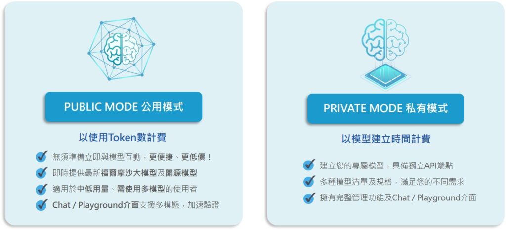 ✓ 使用介面:Public/Private Mode皆支援Chat / Playground介面,輕鬆驗證最新模型。