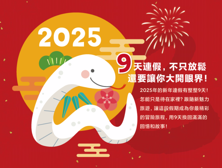 圖片的右側有一段文字,文字的顏色是白色和紅色,文字內容是:“9天連假,不只放鬆,還要讓你大開眼界!2025年的新年連假有整整9天!怎能只是待在家裡?跟隨新魅力旅遊,讓這段假期成為你最精彩的冒險旅程,用9天換回滿滿的回憶和故事!”…
