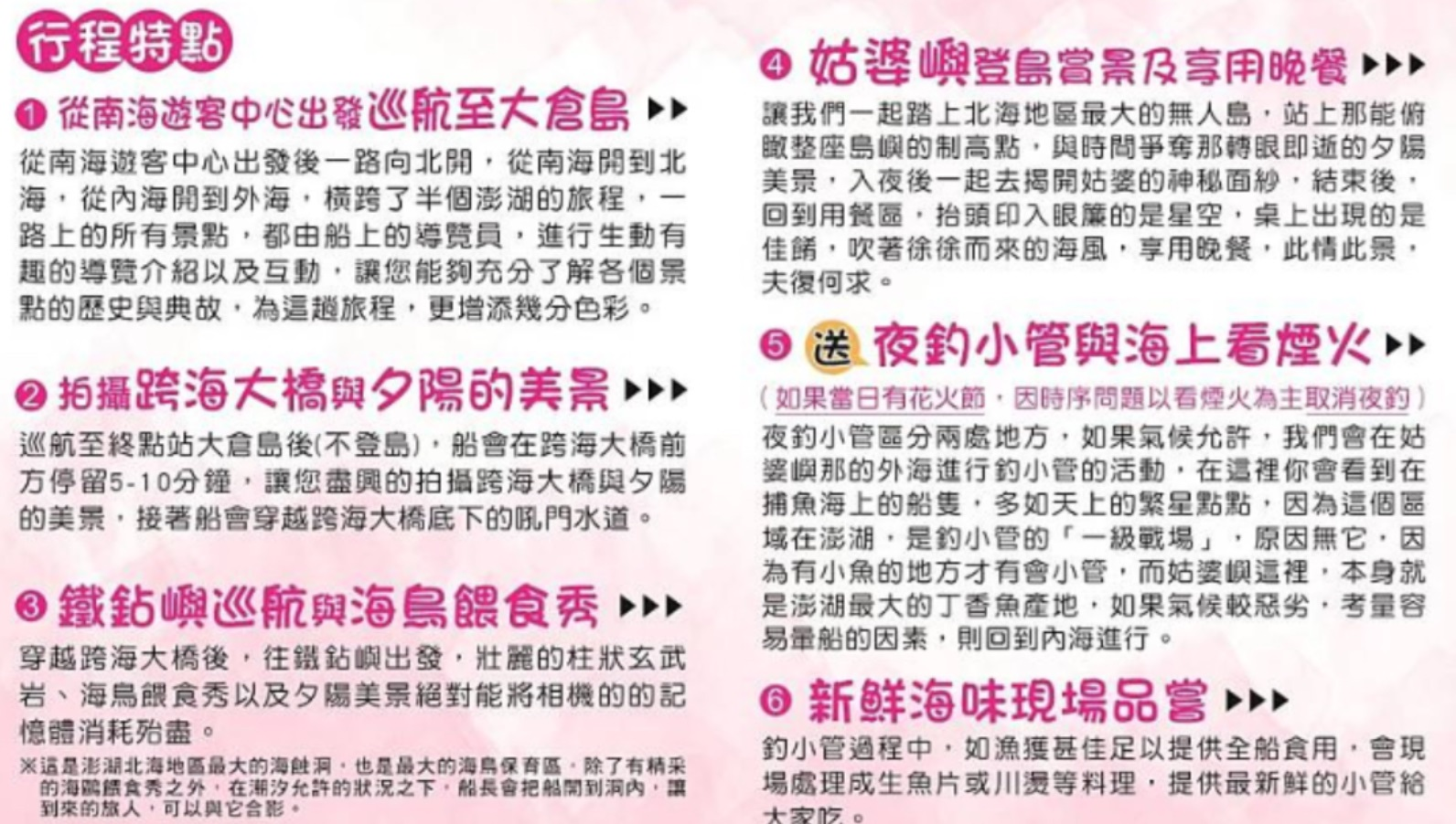 第4個行程的標題是「姑婆嶼登島賞景及享用晚餐」。文字內容如下:讓我們一起踏上北海地區最大的無人島,站上那能俯瞰整座島嶼的制高點,與時間爭奪那轉眼即逝的夕陽美景,入夜後一起去揹妞婆的神祕面紗,結束後,回到用餐區,抬頭仰入眼簾的星空,桌上出現的是佳餚,吹著徐徐而來的海風,享用晚餐,此情此景,夫復何求