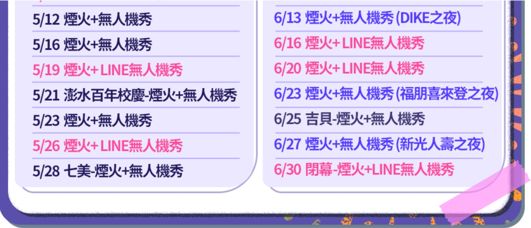 新光之夜在6/27 (新光人壽之夜) 和6/30 (閉幕一壽火 + LINE免人機秀)會舉行。 活動一覽表如下;6/27 (新光人壽之夜) 6/30 (閉幕一壽火 + LINE免人機秀)