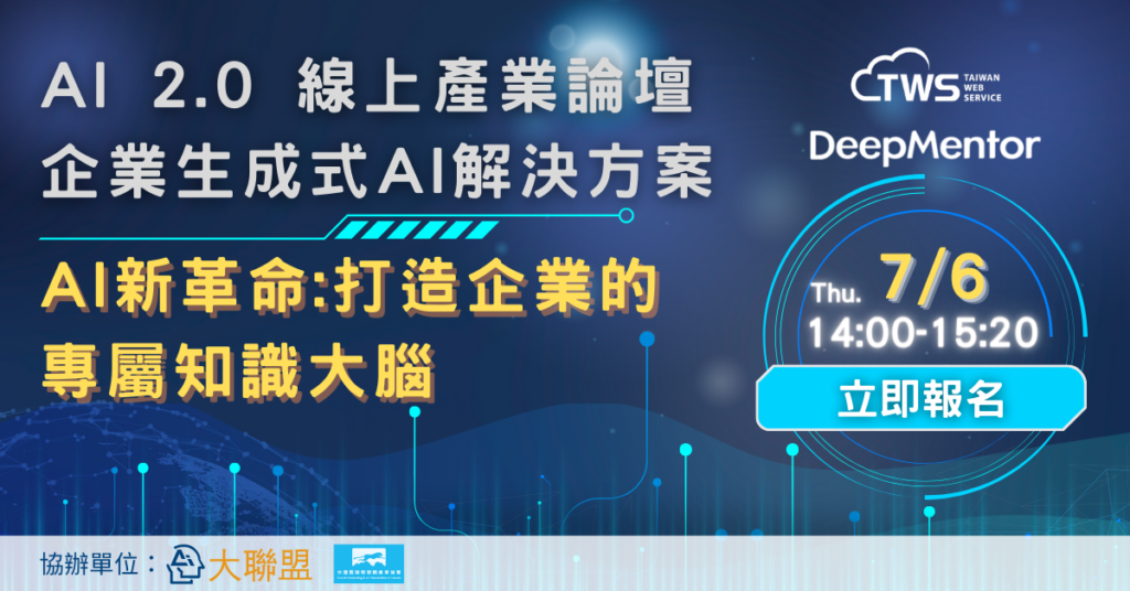 AI 2.0 線上產業論壇-企業生成式AI解決方案 活動專區 / 台智雲 / 2023-06-21 AI 新革命:打造企業的專屬知識大腦 A AI 2.0 線上產業論壇-企業生成式AI解決方案 閱讀全文 »