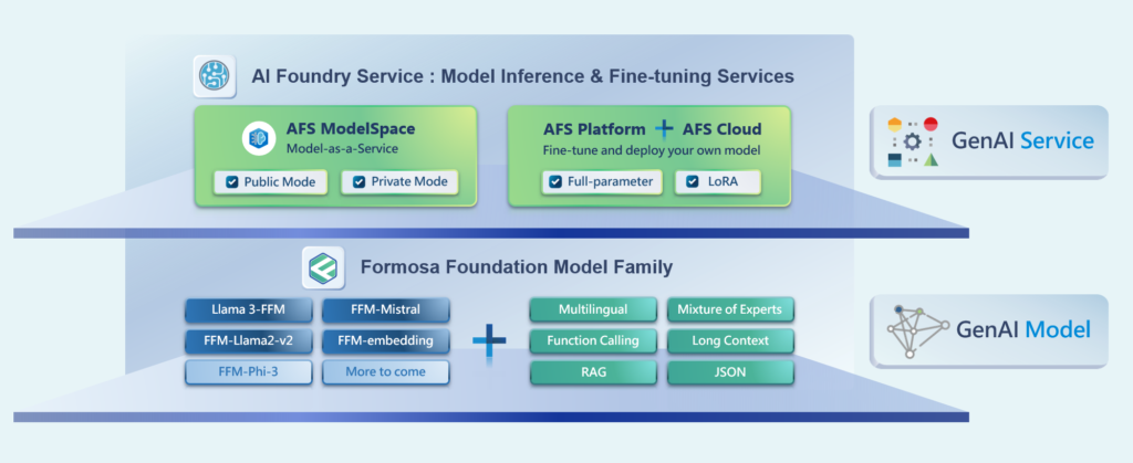 AI Foundry Service (AFS) of Taiwan AI Cloud is a comprehensive enterprise-level generative AI solution, providing an end-to-end service from large language model optimization to inference cloud/on-premise deployment. This includes the “AFS Platform+AFS Cloud” for helping enterprises fine-tune proprietary models and establish inference services, and the “AFS ModelSpace” which offers various Traditional Chinese enhanced Formosa Foundation Models (FFM) and reliable open-source models for quick cloud inference. All these services can be operated using a No-code platform.