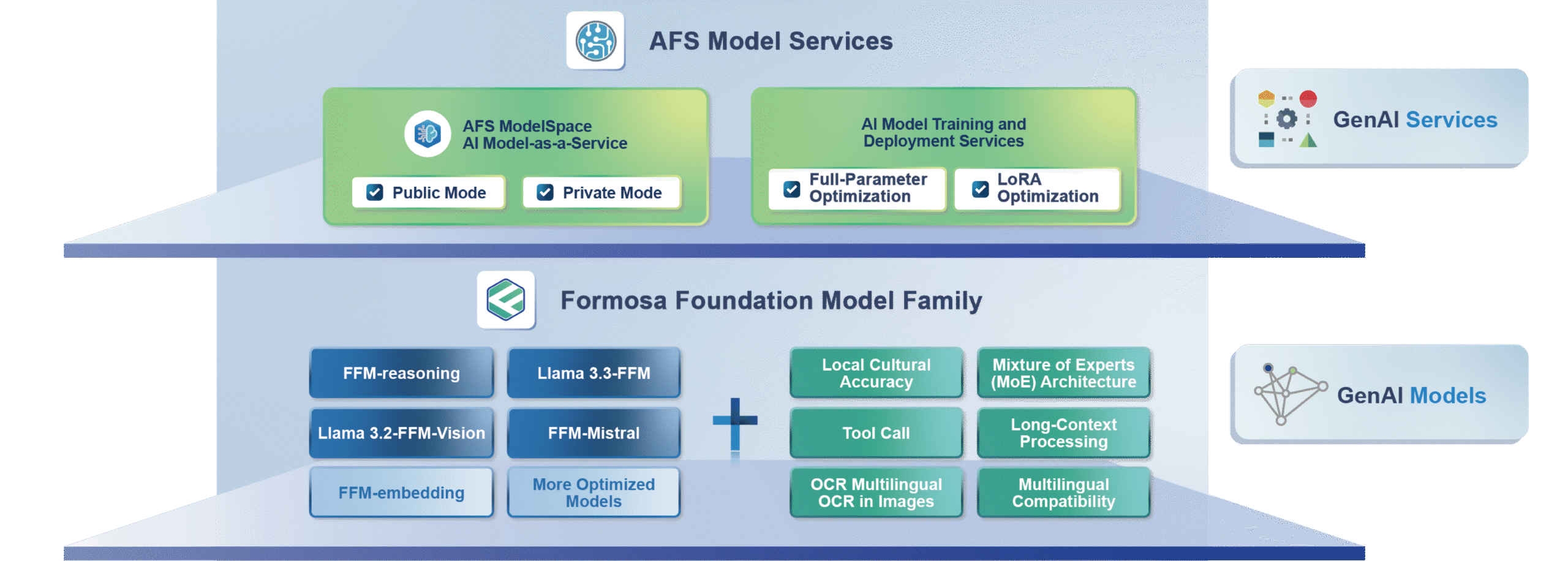 AFS (AI Foundry Service) Model Service is built on our enterprise-grade large language model Formosa Foundation Model (FFM)—designed for local languages and industries—AFS Model Service provides industry-specific AI model training environments, platform tools, and professional consulting. We help enterprises flexibly build, manage, and accelerate the deployment of generative AI applications.