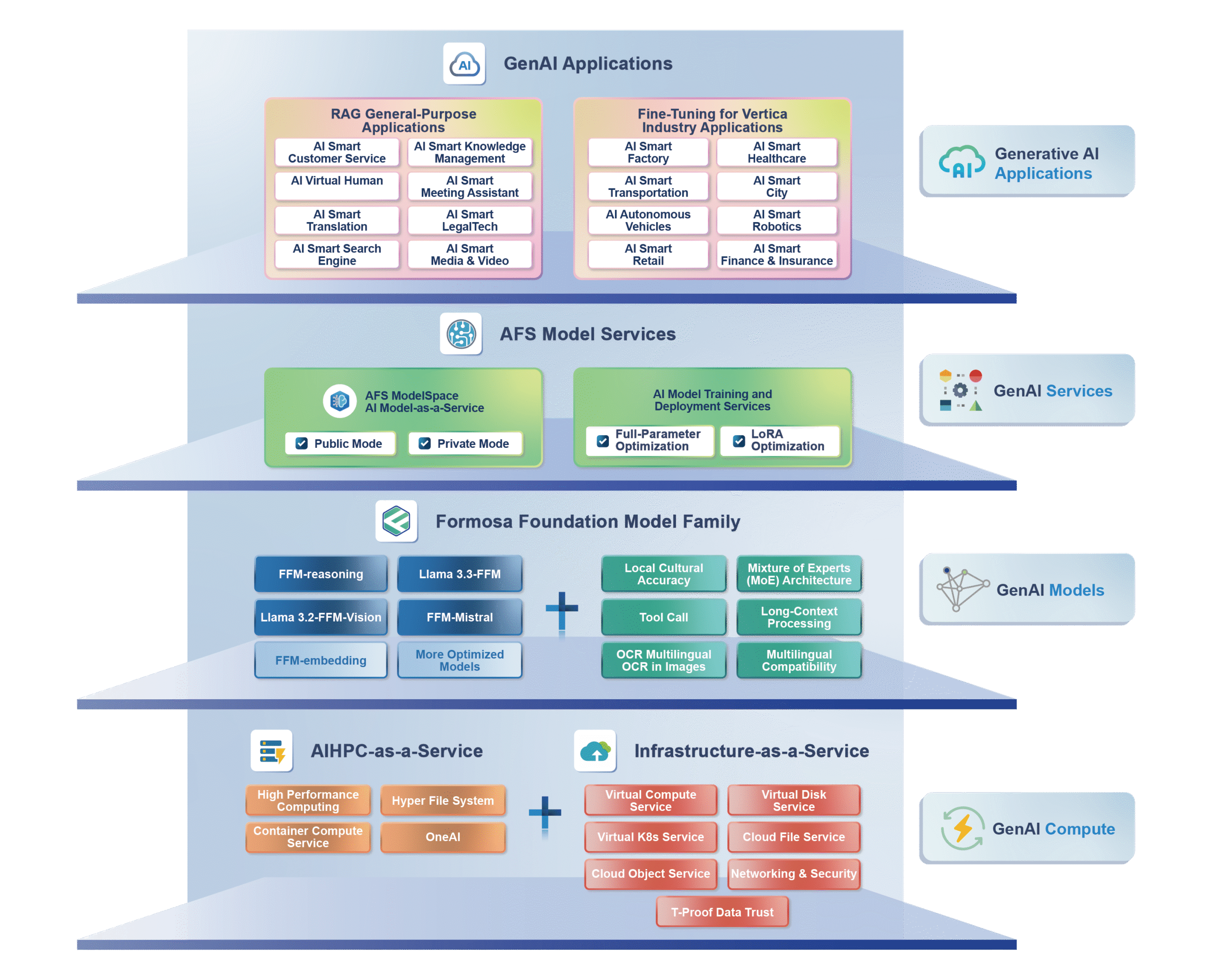 Taiwan AI Cloud provides industry-specific AI application integration services, including custom LLM model fine-tuning, AI deployment planning, and AI training and inference platform development. Built on the Formosa Foundation Model (FFM) — an enterprise-grade large language model optimized for local languages and industries — or other high-performance open-source models, our solutions enable organizations to systematically integrate AI into real-world operations. Through expert consulting and tailored implementation, we help enterprises enhance operational efficiency, optimize customer experience, innovate business models, and build sustainable AI capabilities that drive long-term digital growth.