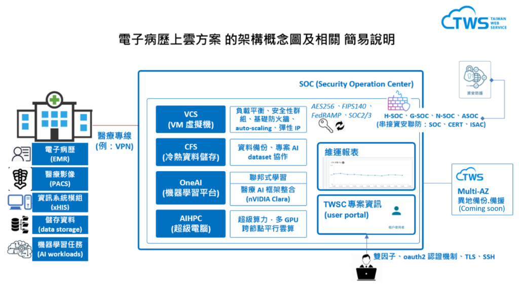 For smart healthcare applications, we offer the OneAI machine learning platform and AIHPC supercomputing power, providing a faster and more convenient AI machine learning development experience, and significantly shortening the R&D time for AI applications and research in smart healthcare.The best practices of this smart cloud healthcare platform also include the maintenance and upkeep of application systems and electronic medical records after they go live, providing operational reports and backup and redundancy mechanisms for uninterrupted application services.