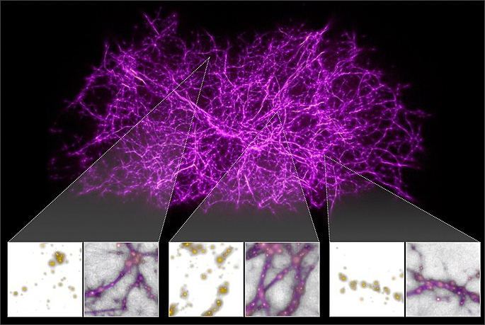 在 Mathuriya[2] 等人(2018) 的研究中,除了生成具暗物質的宇宙資料外,亦設計能在 HPC (High-Performance Computing, 超級電腦)中運行的機器學習演算法,希望能利用當代深度學習(Deep Learning)技術,以加速在大量資料中爬梳出宇宙分佈特徵。機器學習流程以模擬資料為輸入資料,並將模擬資料的參數(包括 σ8每小時8百萬秒差距, Ωm宇宙中物質的比例, N 時空共動切片的曲率)為預測結果,完整的深度學習模型概念圖如下: