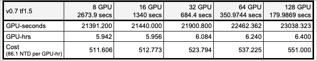 從上表可知為了能加快實驗結果取得,我們將跨節點的計算規模從原本的 8 GPU (1台計算節點)拉高到 128 GPU (16台計算節點)中進行計算,而整體計算成本從原來的 511 NTD 僅提高到 551 NTD,但計算效率確有 14.7 倍的加速。在不修改任何演算法計算邏輯及運算環境的前提下,人工智慧演算法能從 Taiwania 2 計算設施裡直接加快實驗效率,並有效的控管實驗成本。