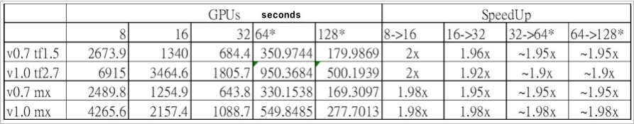在上圖中,Y 軸為運行時間(Time to Mean average error 0.124)、X 軸為跨節點 GPU 數量,曲線中,平均運行時間較低的較有效率。從實驗數據可發現 MxNet (綠色、紫色)均比 Tensorflow (藍色、紅色)在不同版本的 CosmoFlow 資料集中較有效率。這部份我們推斷是因為 MxNet 的資料集,在前處理部分已經經過解壓縮,而在 Tensorflow 計算工作中為運行時才進行解壓縮。更進一步討論跨節點運算加速效果來說,分析如下表: