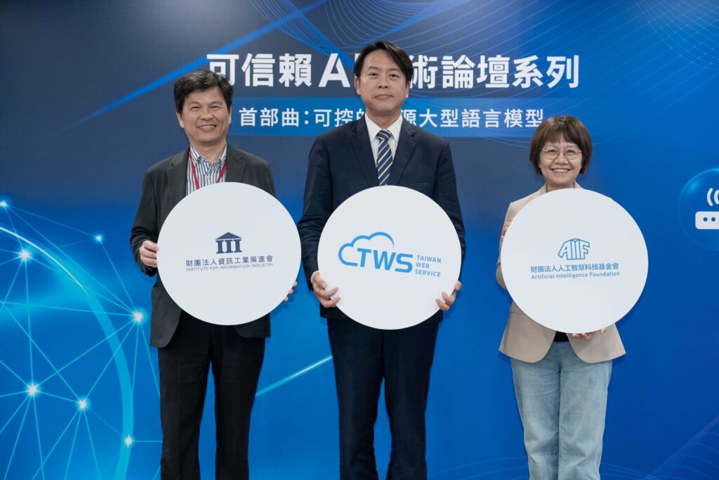 資策會副執行長楊仁達(左起)、華碩雲端暨台智雲總經理吳漢章、人工智慧科技基金會執行長溫怡玲,一起出席支持「可信賴AI技術論壇系列」,首部曲以「可控的開源大型語言模型」為主軸展開精采分享。